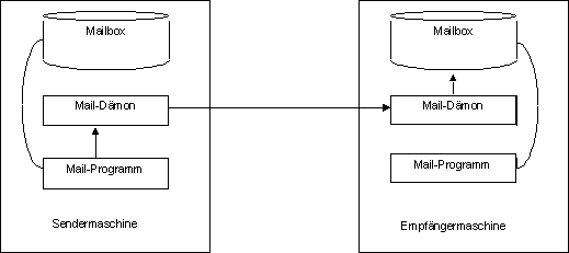 SMTP ging aus dem MIL-Standard 1781 hervor und ist im RFC 821 definiert. Es ist ein e-mail Dienst und ermöglicht die Übermittlung von elektronischen Nachrichten. SMTP bsiert auf dem gesicherten Transport Service von TCP und beschreibt, auf welche Weise Mail-Programme bei der Lieferung einer Nachricht von einem Rechner an einen anderen kommunizieren. Das Format einer Mail ist im RFC 822 beschrieben. In Abbildung 2 ist der Transport einer Mail dargestellt. Sie entsteht im Mail-Programm des Absenders und wird von dort zum Mail-Dämon auf derselben Maschine geleitet. Er ermittelt, an welches Programm der Empfängermaschine die Mail zu schicken ist. Über TCP wird die Mail an den Mail-Dämon der Empfängermaschine geschickt, der sie in einer Mailbox ablegt, bis sie mit einem Mailprogramm gelesen oder gelöscht wird.