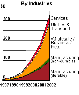 In den meisten Bereichen der Wirtschaft hat ein Wettlauf um den neuen Markt im Internet begonnen. Aus dem Wirrwarr der Begriffe von "e-business" über "e-commerce" zu "business-to-business" kristallisiert sich eines klar heraus: Das Internet scheint für die Ökonomen die Spielwiese des nächsten Jahrtausends zu werden. Das Gold scheint in diesem Bereich förmlich "auf der Straße" zu liegen. In Abbildung 3 ist die Entwicklung des Internets nach Branchen zu erkennen.