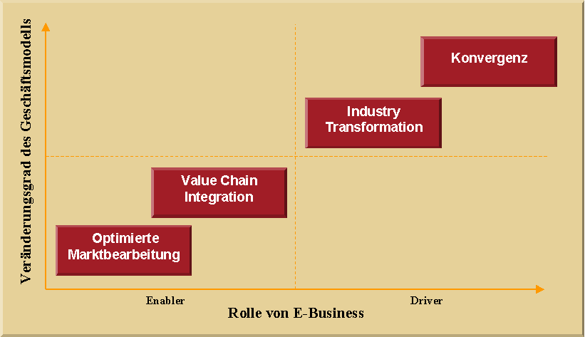 Man geht davon aus, daß in einem ersten Schritt die Marktbearbeitung optimiert wird. Das Unternehmen versucht, seine bestehenden Prozesse ins Internet zu erweitern. in dieser Phase sind die Investitionen relativ hoch, die Veränderung im Unternehmen kann aber noch nicht als drastisch bezeichnet werden.