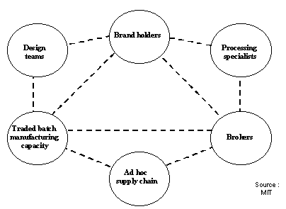 Nach Meinung der Wirtschaftswissenschaften wird das Internet die Struktur der heutigen Wirtschaft extrem stark verändern. Die traditionellen Rollen der Produzenten, Vermittler und Konsumenten werden durch ein Netzwerk von Spezialisten abgelöst, die die verschiedenen Aufgaben der Wirtschaft übernehmen. In Abbildung 5 wird das Netzwerk in der von Wissenschaftlern des MIT gesehenen Art und Weise dargestellt. Der Konsument tritt auf der Suche nach bestimmten Marken mit den Marketing-Unternehmen in Kontakt. Die Markenentwicklung selbst wird an ein Design-Unternehmen ausgelagert. Das Marketing-Unternehmen wird über den Information-Brooker den Prozesspezialisten, die Transportkapazität und die Produktionskapazität ermitteln. Der Prozesspezialist definiert den Transport und den Produktionsprozeß bis die Waren den Kunden erreichen. Zwischen den einzelnen Rollen laufen automatisierte Schnittstellen. Das Vehikel, auf dem dieses Netz von wirtschaftlichen Einheiten "reiten" soll, ist das Internet.