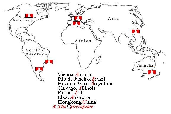 Angelehnt an ihre Reiserouten werden bei oudeis - a world wide odyssey 1998 sieben Bühnen an verschiedensten Orten der Welt aufgebaut, verteilt in etwa, wie es die Karte demonstriert..