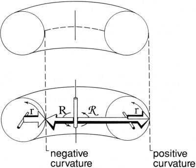 x ),Thirdly, imagine a doughnut-shaped surface, or as mathematicians call it, a torus (pl. tori). Imagine it to be oriented as if lying on a tabletop. (See figure 8.1, p. 162) Choose a point on the inner surface, i.e. on the perimeter of the hole in the middle. (In figure 8.1, see the left-hand side of the lower diagram.) There are two circles here, at right angles: a horizontal circle (whose radius is labeled "R") comprising that inner perimeter; and a vertical circle (whose radius is labeled "r"), that of the cross-section through the dough of the pastry. (If you prefer, imagine two interlocked key rings, touching at right angles.) What makes this case importantly different from the preceding two is that the two radii of curvature are in opposite directions. If one is assigned a positive value, the other must be assigned a negative value. Assume one is +r and the other is R. Then the Gaussian formula gives a negative value for the curvature, i.e. and