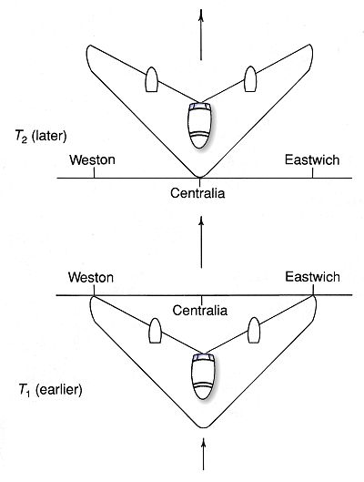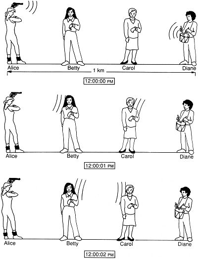 What does it mean for some object to change in time? There are at least two things that might be meant: (1) that the object changes its place, or (2) that the object changes its properties. If being at different places at different times counts as a 'change in time', then the spatial analog is trivially satisfiable. Using the Lexicon, the analogy becomes, 'being at different times at different places'. But this latter is precisely the identical condition, simply restated equivalently. In short, change of place through time just is change of time from place to place. Things which move about in time from place to place also move about in space from one time to another. Movement in place through time is as much movement in time as it is movement in space. What about 'change in properties' through time? An iron object may start out in a glistening, polished state at T1. But over time, without changing its place, it may gradually rust, so that at T2 it is considerably rusted. Is there a spatial analog? Can an object change its properties through space, i.e. at one time have different properties in different places? It is easy to describe such cases. One end of an iron object, at P1, may be in a glistening, polished state. But at the very same time, along the spatial extent of the object, there is more and more rust. At its other end, at P2, it is considerably rusted. The degree of rust progresses, not through time, but through space. This certainly presents itself as a change, only a change in space, not in time. {page 197} From a formal point of view, objects can 'change' as easily in space as they can in time. There seems to be no good reason to restrict the concept of change solely to change in time. Thesis: In just the way in which it is possible for things to change their spatial positions and relations, it is possible for things to change their temporal positions and relations. Change in spatial position is familiar: an object O1 which had been north of another, O2, may later come to be south of that object. But can an object O1 which had been earlier than O2 come to be later than O2? Taylor argues that the answer is Yes, if we take care to spell out the analogy in full. We begin by stating the conditions for change in spatial positions: O1 at T1 is north of O2Using the Lexicon, we create the temporal analog: O1 at P1 is earlier than O2Is this possible? Can an object (or event) occur before another at some place P1 and after that other at a different place P2? Yes, there are indeed such events. Imagine four persons positioned at equal intervals along a straight line. (See figure 8.3, p. 198.) Alice is at position zero; Betty, one-third of a kilometer further along; Carol, at two-thirds of a kilometer from position zero; and Diane, fully one kilometer beyond position zero. They all have synchronized watches, and at 12 noon, Alice fires a starter's pistol and Diane strikes a drum once. Since sound travels through air at 331 m/sec, just about one second later, at 12:00:01 PM, Betty hears the pistol shot and Carol hears the drumbeat. And one second after that, at 12:00:02 PM, Betty hears the drumbeat and Carol, the pistol shot. Where Betty is standing, the sound of the pistol occurs one second earlier than the sound of the drum. Where Carol is standing, the order is reversed: the sound of the drum occurs one second before the sound of the pistol. A now-familiar objection may be expressed: "When we speak of an object changing its position in space, the entire object is present first at one and then the other location. But in this example, the 'entire' event the gunshot or the drum stroke is not present at either place." But, in light of the earlier discussion, the counterobjection {page 198}