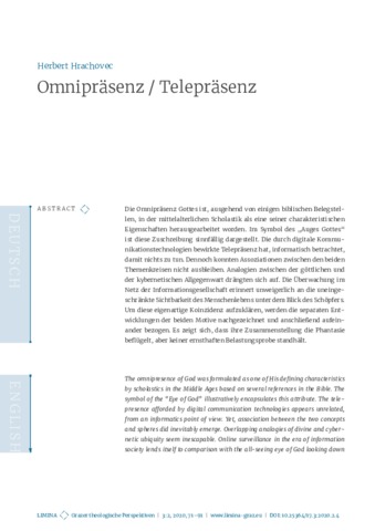 Die Omnipräsenz Gottes ist, ausgehend von einigen biblischen Belegstellen, in der mittelalterlichen Scholastik als eine seiner charakteristischen Eigenschaften herausgearbeitet worden. Im Symbol des „Auges Gottes“ ist diese Zuschreibung sinnfällig dargestellt. Die durch digitale Kommunikationstechnologien bewirkte Telepräsenz hat, informatisch betrachtet, damit nichts zu tun. Dennoch konnten Assoziationen zwischen den beiden Themenkreisen nicht ausbleiben. Analogien zwischen der göttlichen und der kybernetischen Allgegenwart drängten sich auf. Die Überwachung im Netz der Informationsgesellschaft erinnert unweigerlich an die uneingeschränkte Sichtbarkeit des Menschenlebens unter dem Blick des Schöpfers.