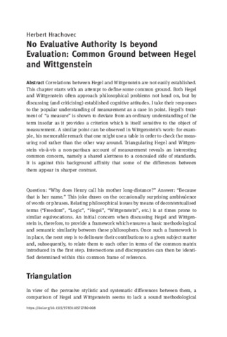 Hrachovec, Herbert (2019) No Evaluative Authority Is beyond Evaluation: Common Ground between Hegel and Wittgenstein. In: Wittgenstein and Hegel. Reevaluation of Difference. On Wittgenstein, 3 (5). de Gruyter, Berlin, pp. 73-88.